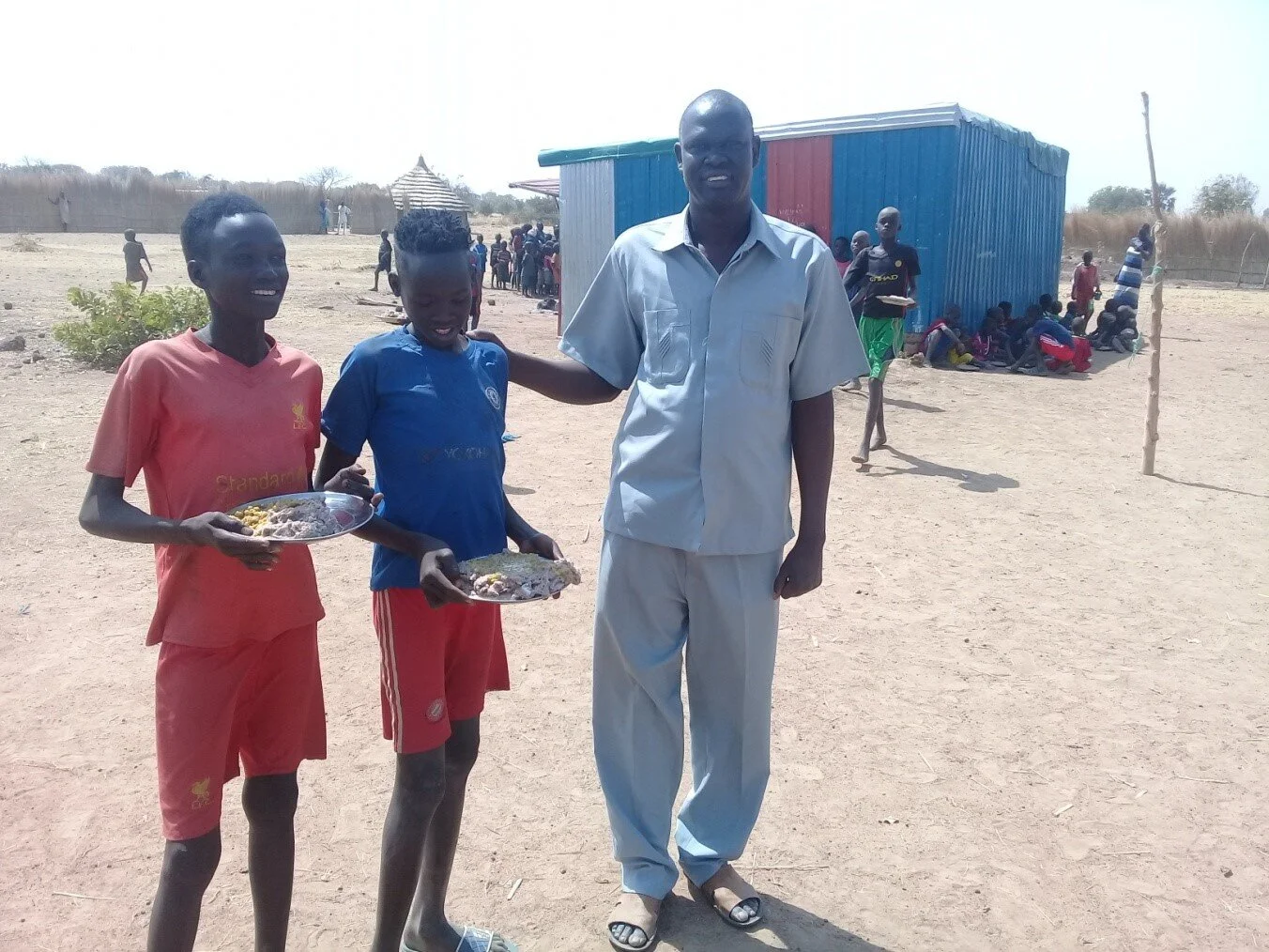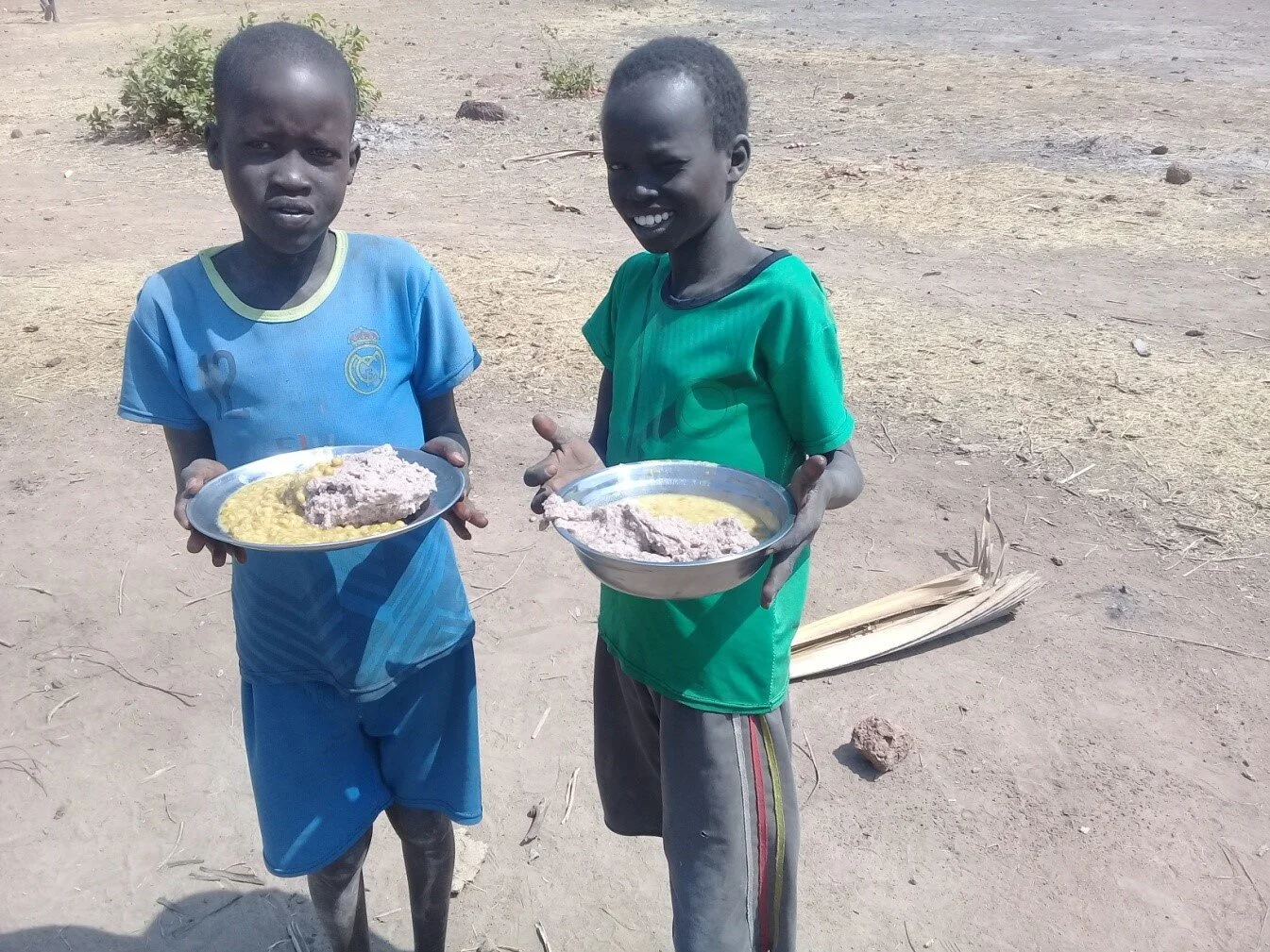 The two boys I am standing with in the picture are Daniel Deng and Michael Garang. They are orphans in the Beliek Feeding Centre. They are aged 12 years and have been benefitting from the feeding program in Beliek since 2015. They live with their guardians in a place that is about two hours walk from the feeding centre. Their guardians are unable to feed them and therefore they walk to the feeding centre five days in a week (Monday – Friday) with a hope of getting a meal.