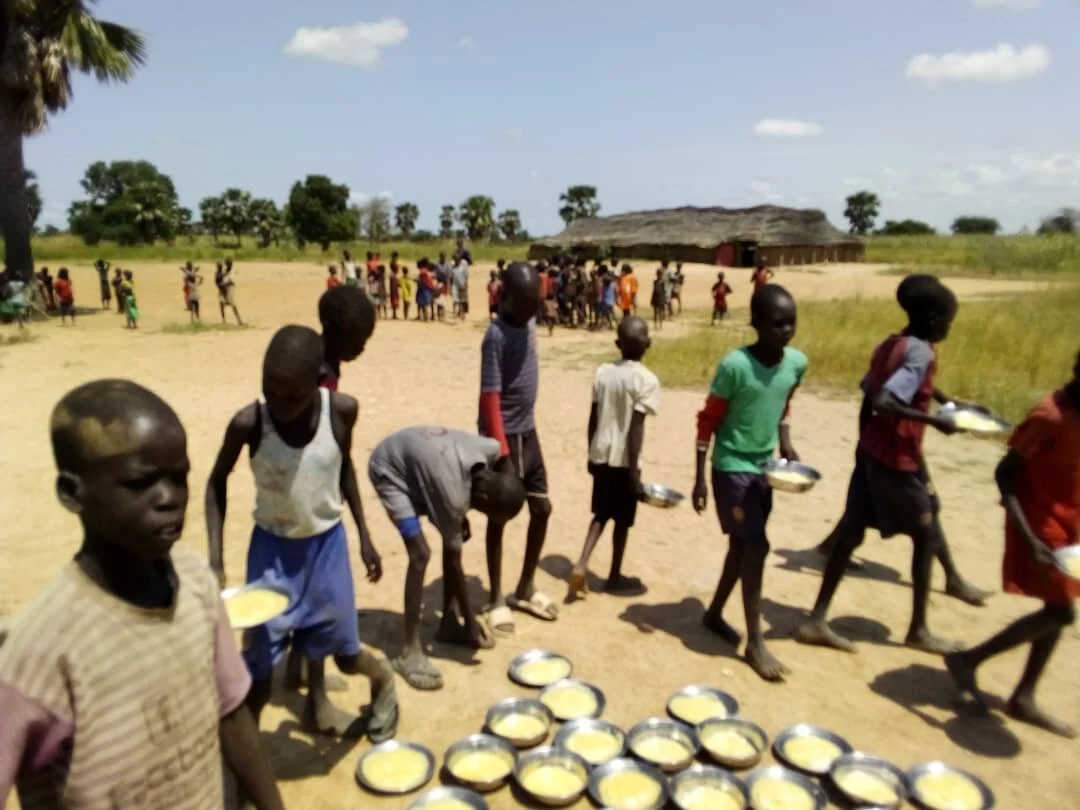 Children at Lueth-wek Village School receiving their meals where we will provide over 16,000 meals in January.